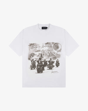 The Biker T-Shirt is a nod to those who ride with vision—never static, never stuck. Featuring a bold halftone front print of bikers tearing down a desert road, it captures the essence of freedom, forward motion, and untouchable momentum. Finished with the words “Always in Motion,” this tee is a visual statement for those who live on their own terms and move with purpose.