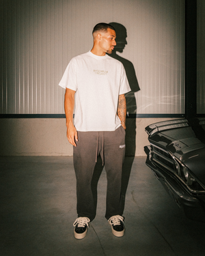 Made from Heavyweight cotton, it offers a dense yet soft feel that holds its shape over time. The distressed collar and hem bring a vintage, lived-in look—while the bold front print marks the beginning of the journey and the mindset that built the brand.