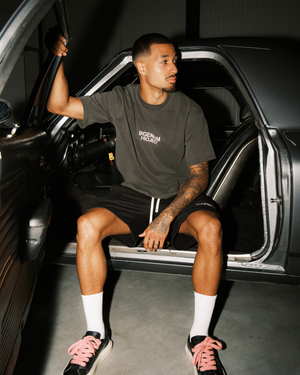 Made from Heavyweight cotton, it offers a dense yet soft feel that holds its shape over time. The distressed collar and hem bring a vintage, lived-in look—while the bold front print marks the beginning of the journey and the mindset that built the brand.